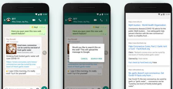 WhatsApp启动了一个名为“搜索网络” 的新工具,该工具使已发送链接的用户可以从网络中快速找到有关他们的信息。在一个示例中,WhatsApp显示了一个链接,该链接指向某人,声称喝煮沸的大蒜水可以治愈。收件人现在可以按放大镜按钮以搜索有关链接的信息。在该示例中,向用户显示了来自事实检查网站的Web结果,证明该声明是错误的。