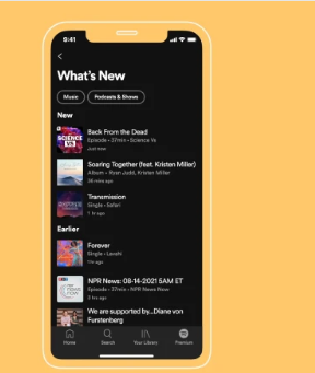 值得一提的是,What's New提要包含过滤器,可让用户对新音乐发布或新播客和节目集进行排序。要让您最喜欢的艺术家在发布新内容时出现在“最新消息”提要中,只需访问他们在 Spotify 上的页面并点击“关注”。