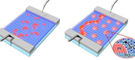 研究小组通过使用铂纳米粒子成功地提高了设备的开关效率。当向设备施加电压时,电流“跳过”这些粒子并发生快速相变。