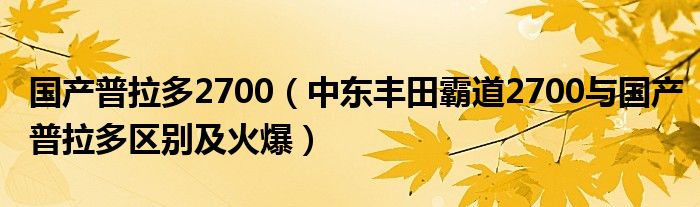 4,普拉多2700国产和霸道的区别 :所谓的霸道就是普拉多,其实这车叫普拉多,只是进过国内市场的时候有了一则广告门事件,被国人骂了,广告语叫 霸道你不得不尊敬,但是确是弄的卢沟桥场景,所以被国人骂了,丰田道歉了,但是这车的越野性能很强悍,所以这句广告语中的霸道,就成了普拉多的民间名字了,所以我们说的霸道,其实就是丰田普拉多。