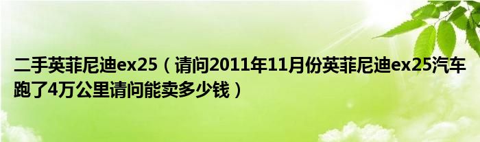 大家好,小常来为大家解答以下问题,对于二手英菲尼迪ex25,请问2011年11月份英菲尼迪ex25汽车跑了4万公里请问能卖多少钱很多人还不知道,今天让我们一起来看看吧!