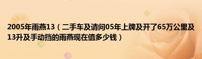 1,请问05年上牌 开了65万公里 13升 手动挡的雨燕现在值多少钱 :您好!山东市场上2005年雨燕05款 手动豪华型 手动挡 市场价格在5.00万左右二手雨燕相关信息:http://www.ucar.cn/buycar/serial/yuyan/