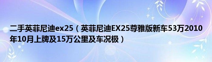 1,英菲尼迪EX25尊雅版新车53万2010年10月上牌 15万公里 车况极:英菲尼迪的残值率很高的,这个车的话,顶多15%的折旧费。不过要看卖主心态了。二手车商收价都不低