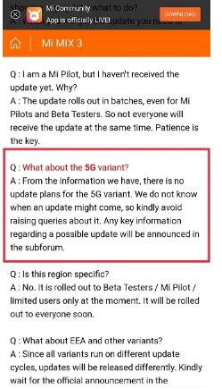 最近,该公司在Mi社区(通过PiunikaWeb)上发布了有关常规(4G)Mi Mix 3的MIUI 12更新的帖子。它在底部包含一个问答环节,其中一个问题询问“ 5G变体如何?”