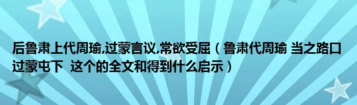 关于后鲁肃上代周瑜,过蒙言议,常欲受屈,鲁肃代周瑜 当之路口 过蒙屯下 这个的全文和得到什么启示这个很多人还不知道,今天菲菲来为大家解答以上的问题,现在让我们一起来看看吧!